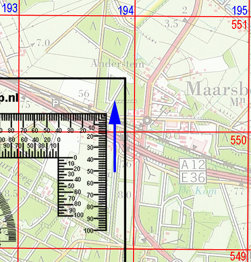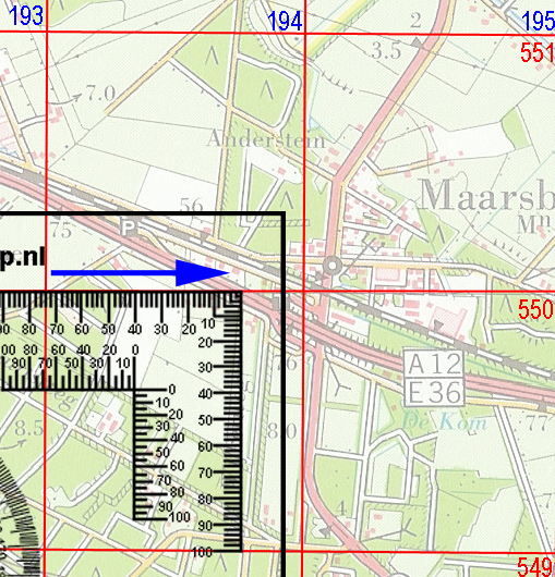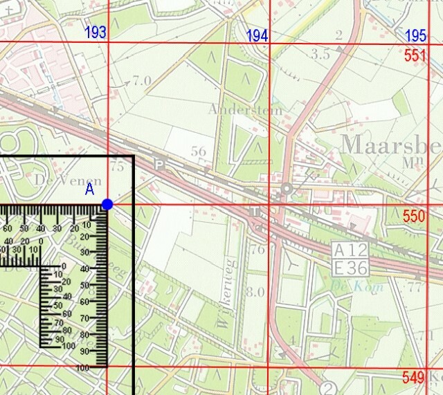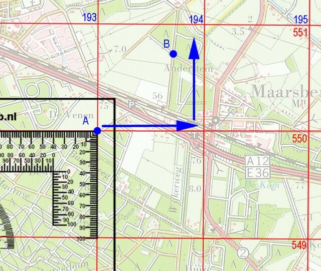 Op de kaarthoekmeter worden vaak meerdere schalen vermeld. Gebruik de schaal die klopt met de schaalverdeling van je kaart. Stel je krijgt het coördinaat 193.74 – 550.17. Zoek dan eerst de kruising van verticale lijn 193 met horizontale lijn 550 (Punt A).