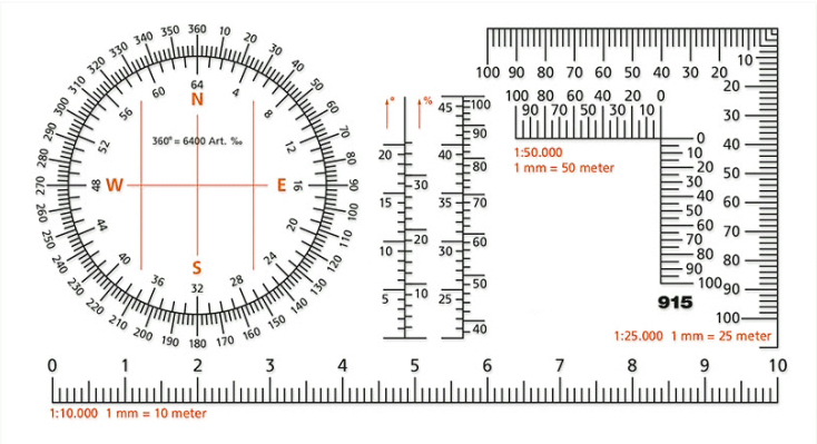 Om nauwkeurig te werken met coördinaten op een topografische kaart heb je een kaarthoekmeter nodig.